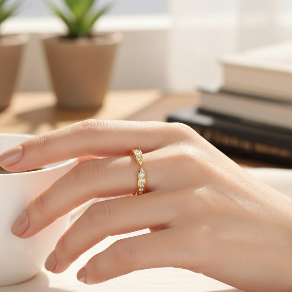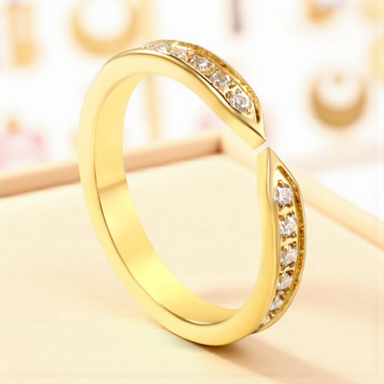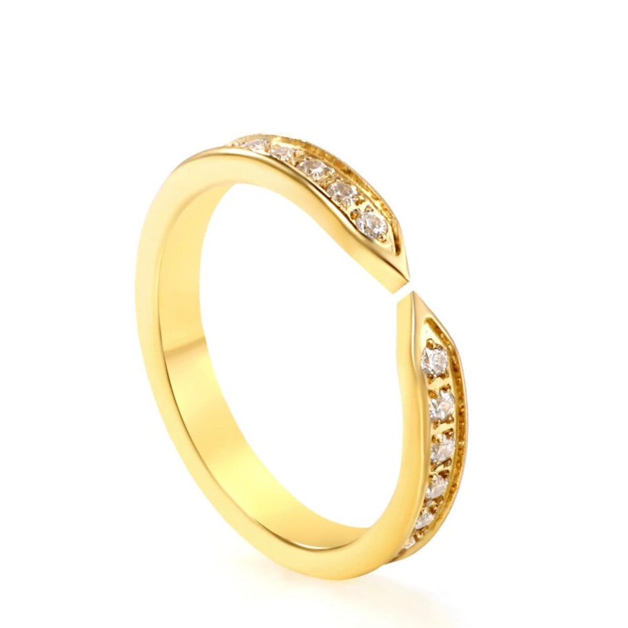 This open-cuff band features a brilliant accent of stones. The band has a sleek, polished gold finish and is designed with an intentional gap at the center front, where the two ends almost meet. Both sides of the opening are gracefully curved, with two rows of small, round clear stones.